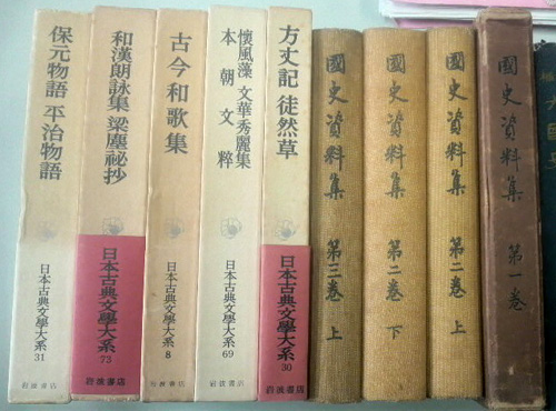 《国史资料集》少了第三卷下,嘛不过是战国以后的时代所以损失不大,只要镰仓和南北朝的都在就行。卖岩波的这套日本文学大系的不管哪家都没有《菅家文草》,倒是意外地斩获了《保元物语》和《平治物语》还有《梁尘秘抄》,《本朝文粹》这个也是以前想要的。其他两本是为了凑三本500元随便拿的。
