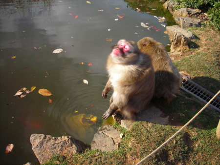 山顶有个小水池,猴子们特别爱玩水。注意那条大黄鲤鱼。