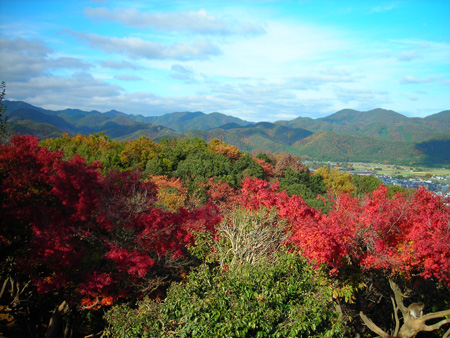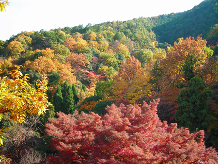 深秋的岚山真的是太美了!因为红叶的红色深度和层次不同,远望群山被染得色彩斑斓的,套用《枕草子》里一句很俗的话,“就像画里似的那么美”。